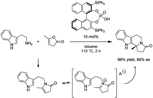 Dixon included a chiral phosphoric acid as part of a reagent cocktail effecting a cascade sequence involving a Pictet-Spengler-like cyclization (Scheme Dixon 2009).(10.1021/ja9024885) Tryptamines and lactones formed ketoamides with an appended π-nucleophile that underwent enantioselective cyclizations in the presence of chiral phosphoric acids, and it was again shown that aromatic substitution of the BINOL ring system was essential for high ee. The method could be used with more substituted lactones to effect high levels of diastereocontrol: the combination of a disubstituted enol lactone with tryptamine gave isolable intermediates, the structures of which implied that the formation of the reactive iminium ion was fast and reversible, and that final ring closure occurred with one matched catalyst/substrate pair. The mechanism of the enantiodetermining cyclization is presumed to be via a tight ion pairing between iminium ion and catalyst conjugate anion. High yields and stereoselectivities could be obtained for diverse products using this methodology, which was shown to be compatible with a one-pot cascade process that also included a gold(I)-catalyzed step to generate the initial lactone.