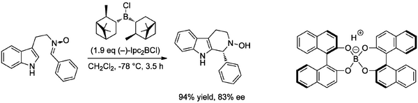Enantioselective approaches, where the stereocontrol of the cyclization is not governed by a stereocentre already in the cyclization precursor, have received much less attention than the diastereoselective, racemic or achiral version of the PS reaction. It was shown in 1996 that the PS reaction could be effected with superstoichiometric Lewis acid - in this case the cyclization of the (Z)-nitrone derived from Nb-hydroxytryptamine using diisopinocampheylchloroborane (Ipc2BCl) to give the corresponding tetrahydro-β-carboline products (Scheme Nakagawa 1998).(10.1016/0957-4166(96)00134-6 and 10.1021/jo980810h and 10.3987/REV-98-SR1) The racemic cyclization could be effected with Bronsted acid and a number of achiral Lewis acids, but it was found that Ipc2BCl gave high yields and ee with reduced temperatures. Lowering the quantity of Ipc2BCl to 0.5 eq. caused a significant reduction of yield, while attempts to alter the Lewis acidity by substitution of the chloride (with e.g. fluoride or triflate) did not improve yield or ee. The proposed reaction mechanism involved the formation of an iminium ion with coordination of the nitrone oxygen to the Ipc2BCl boron centre, and preliminary modeling confirmed a difference in transition state energies for approach of the indole from the re- and si-faces of the iminium ion. It was found that iminium ions derived from electron-deficient aldehydes gave poor enantioselectivity, but that these cyclizations were effective (with 74% ee in the case of the nitrone derived from 4-nitrobenzaldehyde) when a different reagent was added, a boronate incorporating two BINOL ligands (X) that had been previously described by Yamamoto for aldol-type reactions of imines.(10.1021/ja00102a019) The mechanism of action of such a boronate was suggested to involve replacement of one of the coordinating BINOL oxygen atoms with that on the nitrone, and it is not clear why such a mechanism could not operate catalytically. Nevertheless this was the first report of a reagent-controlled enantioselective PS reaction; earlier work by Nakagawa employing a similar approach had led to cyclization, but to give enantioenriched spiroindoline products.Paper Chiral Bronsted acids were ultimately successfully applied to the catalytic, enantioselective PS reaction through the use of a phosphoric acid, rather than a boronate, as described below.