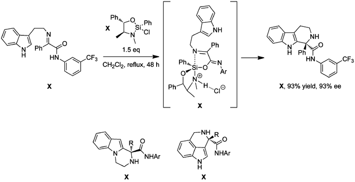 A chiral Lewis acidic silane reagent (X, Scheme Leighton 2009) was shown to be effective in promoting highly enantioselective PS reactions.(Leighton 2009 10.1002/anie.200806110) The substrates (e.g., X) contained α-ketoamide ketimines: NMR studies suggested that following O-silylation, the proton from the NH group transfers to the reagent's nitrogen atom and activates the complex (X) to cyclization. Electron-withdrawing groups on the N-aryl ring improved the reaction rate. The quaternary stereocentre could be generated even with sterically demanding aryl groups appended to the imine, such as 1-naphthyl (product ee 87%). A one-pot procedure was also developed in which the initial amine and α-ketoamide were allowed to react, followed by the addition of the silane (X). The process was shown to be effective on a 5 mmol scale with 1.3 equivalents of silane, which was quantitatively recovered following work-up of the reaction. It was subsequently shown that the same (now commercially-available[Leighton 2010]) reagent could be used with similar effectiveness in the synthesis of the more ususual PS reaction products X and X, derived from the less common indole amines (1H-indol-4-yl)methanamine and 2-(1H-indol-1-yl)ethanamine.[Leighton 2012 10.1021/ol300922b] The latter heterocyclic framework had just been synthesized using the enzyme strictosidine synthase (see section X).