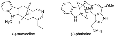 Secondly, and probably consequently, the general structures one can access through the PS reaction - alkaloids with a stereocentre adjacent to an aromatic ring - are often highly bioactive, and are of interest for the development of new medicines. This has led to a great deal of interest in controlling the stereochemical outcome of PS reactions. Most of this work has involved understanding diastereoselective PS reactions, employing either an existing stereocentre that remains in the final product (often derived from an amino acid) or a stereocentre in a chiral auxiliary that is eventually removed, directs the ring closure.Cook 1995(Need: What was the first diastereoselective example? Cook 1992 Cook[Larghi 2005, review, no DOI][Youn 2006] This approach has been used in several notable total syntheses, among them (-)-suaveoline (Cook, 1992) and (-)-phalarine (Danishefsky, 2010). (Need: combine the two structures below with the general scheme for this part)