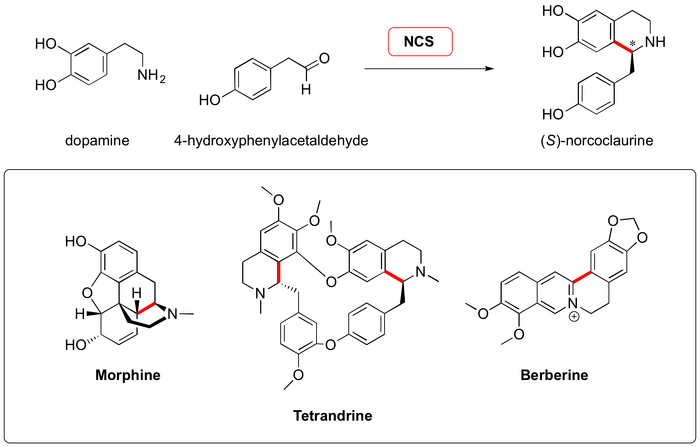 The reaction is important for two reasons. Firstly, Nature uses this chemistry. Enzymes ("pictet spenglerases") carry out the PS cyclization to produce important intermediates which feed into many biological pathways that result in bioactive small molecules, such as strychnine, morphine, vinblastine and reserpine. All monoterpene indole alkaloids are thought to be made via this route, the key intermediate of which is strictosidine, formed from a PS reaction between tryptamine and secologanin.