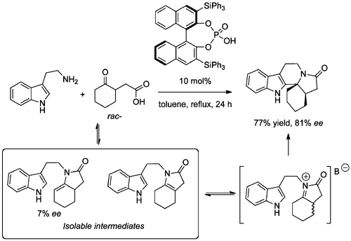 The method was broadened to allow the use of racemic keto acids and esters in place of the enol lactones, again with polycyclic products being produced in high yield and ee (79-98%). (10.1021/ol101651t). If the reaction time was reduced, enamides could again be isolated, one achiral and the other chiral with an ee of only 7%. Either enamide gave the intended product with an ee of 83% when resubjected to the reaction conditions, supporting the fast, reversible formation of iminium ions which are trapped by an enantioselective cyclization event controlled by the chiral acid. Possibly mention the racemic oxo acid.