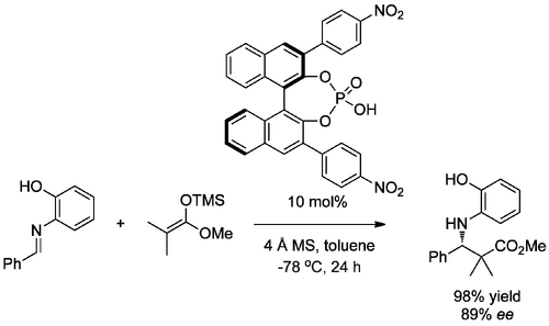 Akiyama (10.1002/anie.200353240) reported chiral phosphoric acids prepared from arylated BINOLs in the enantioselective Mannich-type coupling of silyl enolates with aldimines (Scheme Akiyama 2004). High yields and enantio- (as well as, in appropriate cases, diastereo-) selectivities were observed with a variety of substituted aldimines and enolates (What's "high" for this reaction? Akiyama reports 81-96% ee, and given that the group reports several "100% yields" I'm inclined towards suspicion -MAT). Limitations to the methodology were that an ortho hydroxy group was required on the N-aryl ring of the aldimine (Why? Mechanistic raionale? - MAT), and that aldimines derived from aliphatic aldehydes did not participate effectively. Typical catalyst loading was 10 mol%. The structure of the catalyst itself may be thought of as a chiral proton, i.e., a proton surrounded by a chiral environment, particularly given the aromatic rings of the BINOL and the 3-substituents are non-coplanar. However, the proposed mechanism operates via an ion pair of phosphate and iminium ion. The bond-forming event would naturally disrupt such an ion pair, ensuring catalytic turnover. (ultimately need a scheme of this very general idea [nice example in the Akiyama paper here] but may go in mechanism section)