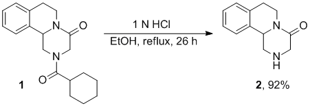 3) 2-Acyl-4-Oxo-Pyrazino-isoquinoline Derivatives and Process for the Preparation Thereof, J. Seubert, H. Thomas, P. Andrews, US Patent 4,001,411, 1977 (German Patent 2,362,539, 1973) - this contains the partially-successful attempt to reduce the intermediate enamide asymmetrically with Raney Ni modified with tartaric acid.