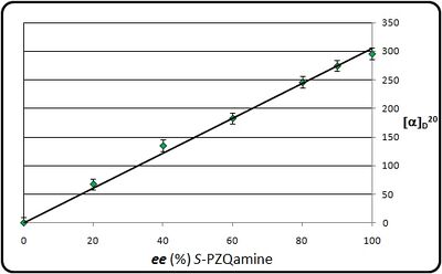 Given that many people may not have access to the column necessary for the determination of the enantiomeric excess of PZQamine, we confirmed that, in ethanol at a convenient concentration, the optical rotation and enantiomeric composition of PZQamine are linearly related (Figure X). Thus purification of PZQamine to constant melting point and measurement of the optical rotation under these conditions will give an adequate measure of the enantiomeric excess achieved in the resolution without the need for chromatographic analysis. In fact a linear relationship is also seen for PZQ itself under related conditions, as well as a linear relationship between concentration and observed optical rotation up to 1 g per mL (correct concentration?) ([Figure X]).