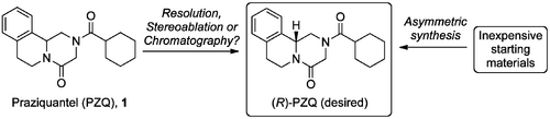Other asymmetric syntheses: There have been two reports of enantioselective syntheses: 1. Total Synthesis of (-)-Praziquantel: an Anthelmintic Drug, C. Ma, Q.-F. Zhang, Y.-B. Tan and L. Wang, J. Chem. Res. 2004, 186-187 (DOI: 10.3184/0308234041640564); 2. Enantioselective Synthesis of (R)-(-)-Praziquantel (PZQ), P. Roszkowski, J. K. Maurin and Z. Czarnocki, Tetrahedron: Asymmetr. 2006, 17, 1415–1419 (DOI: 10.1016/j.tetasy.2006.04.023). There is also a report of the chromatographic separation of PZQ enantiomers on a preparative (gram) scale using a cellulose triacetate support (Meyer 2009).