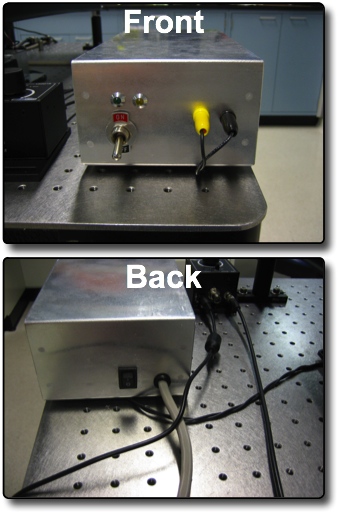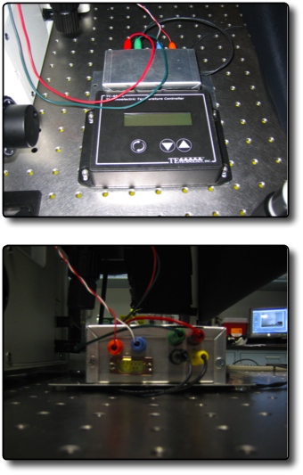 Once the thermistor is on the objective, you can put the flexible heating element on it. Thankfully the stuff from Omega has a sticky back to it so just peel and stick it on the objective. I've been using for about a week now and have had no problems with it. As you can see in the picture, There are 2 alligator clips attached to the heating element. I had to do this since I couldn't for the life of me solder anything to the leads. Those wires run to the temperature controller and connect to it via banana connectors.