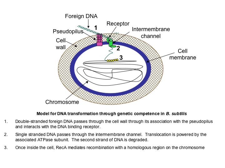Competence for genetic transformation  is the ability of cells to take up naked DNA from the environment and incorporate this DNA into the chromosome through homologous recombination.  Here is a simplified diagram of competence in B. subtilis: