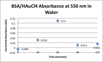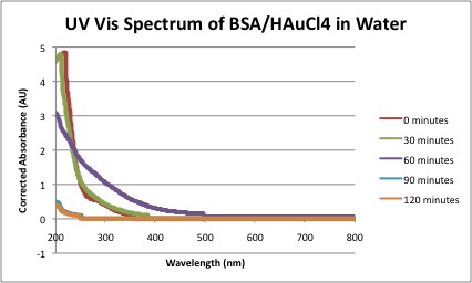 - 1 mL of 0.0015 mM BSA (Bovine Serum Albumen) and 1 mL of 0.25mM of HAuCl4(Chloroauric Acid) were mixed along with a 8mL buffer of 50mM acetate (pH 5.46).