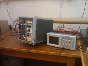 - We found that the PMT and LED were already set-up before we had started, as well as the power supplies and the oscilloscope. After verifying that all the BNC cables connected to the correct slots we proceeded with adjustments. We checked to make sure that the main power supply was at 2000V and the offset to 400V. We set the delay to 16 ns. We then set our TAC such that 0.1 V = 1 ns.