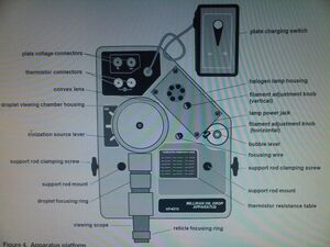 The purpose of this experiment was to use the Millikan oil drop apparatus to discover the charge on individual oil drops. We are then supposed to notice that the charges are a multiple of some elementry, or minimal charge.