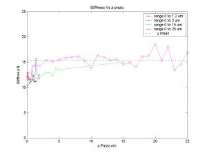 Started at the surface (z=0) and went up in .2um increments (At z-piezo .1um belongs to 20mVolts) up to 2 um into the sample. Average stiffness is 12pN, and its better above .8 um.