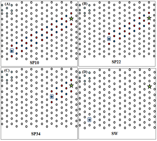 [[Image:SP_Origami.bmp|thumb|right| | [[Image:SP_Origami.bmp|thumb|right|500px|Figure 3. Figure 9. Origami layouts in SPEX experiments. Cyan, markers used to check origami orientation under AFM. Blue, Track 1. Red, Track 2. White, DNA staples only. Five-pointed star, walker goal. Rectangles indicate the starting position for random walk. ]] | ||