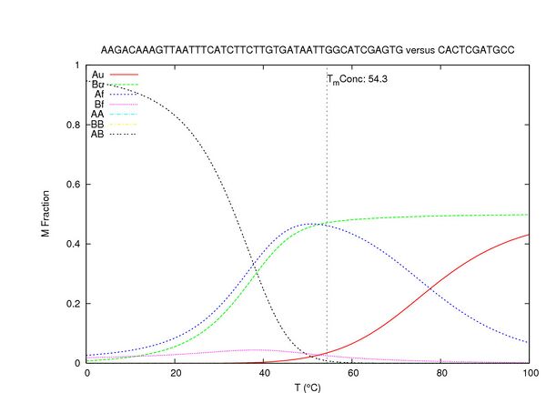 The image shown below is one example of simulation using DINAMelt (http://mfold.rna.albany.edu). This is a simulation of the melting temperature and the possibility of correct hybridization. This is simulated under a situation of