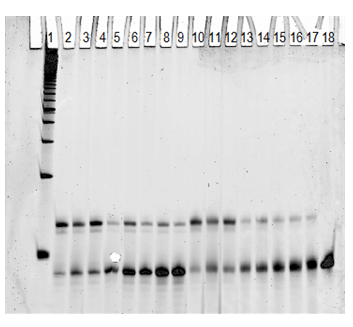 [[image:optim1.png|center|frame|Figure opt.1 Optimization reaction at pH 7.4 with PEG1K and DNA oligo. 1) 25 bp DNA ladder, 2) 20 µM DNA, 5 x PEG1K, 3 hours incubation, 3) 20 µM DNA, 2.5 x PEG1K, 3 hours incubation, 4) 15 µM DNA, 5 x PEG1K, 3 hours incubation, 5) 15 µM DNA, 2.5 x PEG1K, 3 hours incubation, 6) 10 µM DNA, 5 x PEG1K, 3 hours incubation, 7) 10 µM DNA, 2.5 x PEG1K, 3 hours incubation, 8) 5 µM DNA, 5 x PEG1K, 3 hours incubation, 9) 5 µM DNA, 2.5 x PEG1K, 3 hours incubation, 10) 20 µM DNA, 5 x PEG1K, 20 hours incubation, 11) 20 µM DNA, 2.5 x PEG1K, 20 hours incubation, 12) 15 µM DNA, 5 x PEG1K, 20 hours incubation, 13) 15 µM DNA, 2.5 x PEG1K, 20 hours incubation, 14) 10 µM DNA, 5 x PEG1K, 20 hours incubation, 15) 10 µM DNA, 2.5 x PEG1K, 20 hours incubation, 16) 5 µM DNA, 5 x PEG1K, 20 hours incubation, 17) 5 M DNA, 2.5 x PEG1K, 20 hours incubation, 18) Control DNA oligo]] | |||