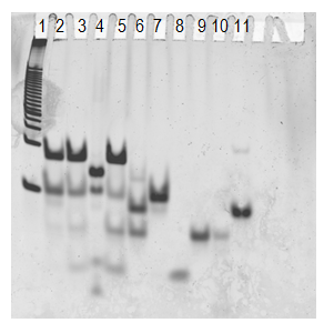 [[image:optim3.png|center|frame|Figure opt3. Annealing of different ratios of sisiRNA visualized on native PAGE. lane1: 25 bp DNA ladder; lane 2: annealing (1:1:1); lane 3: annealing (1:1.5:1.5); lane 4: annealing (1:1.5:1.5) + TCEP; lane 5: annealing (1:2:2); lane 6: annealing without W004 (1:1:0); lane 7: annealing without W179 (1:0:1); lane 8: control W004; lane 9: Control W179 C6 amino linker; lane : Control W179 + TCEP; lane 11: Control W376]] | |||