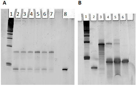 1) 25 bp DNA ladder, 2) 20 µM DNA oligo, 2.5 x GALA, pH 6, 3) 20 µM DNA oligo, 5 x GALA, pH 6, 4) 20 µM DNA oligo, 2.5 x GALA, pH 7.4, 5) 20 µM DNA oligo, 5 x GALA, pH 7.4, 6) 20 µM DNA oligo, 2.5 x GALA, pH 8, 7) 20 µM DNA oligo, 5 x GALA, pH 8, 8) Control DNA oligo | |||