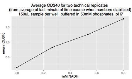 ** [[image:mM NADH on Molecular Devices.png|thumb|center|upright=1.5|Example of 0 -> 0.8 mM NADH measured at 340nm with 150uL per well on our Molecular Devices machine]] | ** [[image:mM NADH on Molecular Devices.png|thumb|center|upright=1.5|Example of 0 -> 0.8 mM NADH measured at 340nm with 150uL per well on our Molecular Devices machine]] | ||