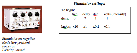 - Check the Stimulator settings to make sure they match the image/table (below). Fill the plastic nerve chamber with amphibian Ringers. Gently place the nerve over the first five or six electrodes starting at the left hand side of the chamber (see instructor). The nerve end on the left side of the chamber should be the anterior end of the nerve. The anterior and posterior ends of the nerve are color coded with string. See your instructor if you are unsure of the color coding.