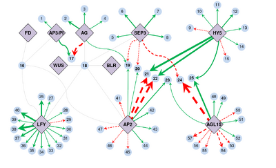 [[Image:Bmcsysbiol-misra-sriram-2013-fig2.svg|thumb|right|400px|'''Fig. 3. An Arabidopsis transcription factor-gene regulatory network as quantitatively deduced by network component analysis.''' | [[Image:Bmcsysbiol-misra-sriram-2013-fig2.svg|thumb|right|400px|'''Fig. 3. An Arabidopsis transcription factor-gene regulatory network as quantitatively deduced by network component analysis.''' SVG file; click twice (once here and once on the subsequent page) for full figure in high resolution. From [http://www.biomedcentral.com/1752-0509/7/126/abstract this publication].]] | ||