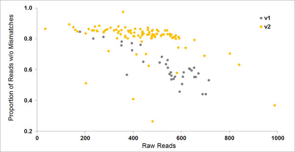 We closely monitor the quality of NextSeq runs. With the newly released v2 chemistry for Nextseq, we see a marked increase in quality (pictured). We aim to get the highest number of reads without sacrificing data quality. If you have a preference for high number of reads (slightly lower data quality) or high data quality (slightly lower number of reads), please let us know so that we can adjust your loading concentration accordingly. | |||