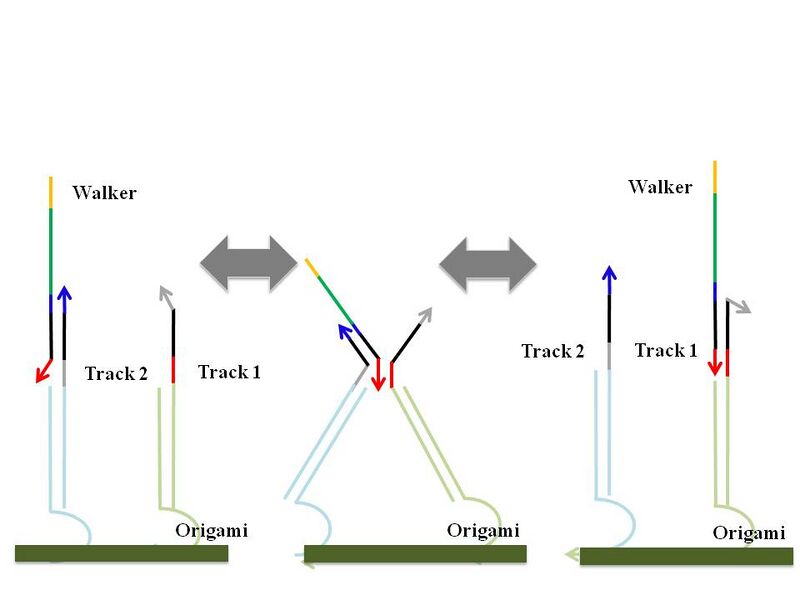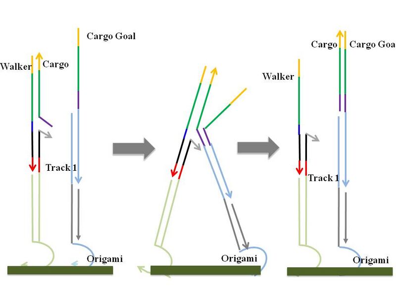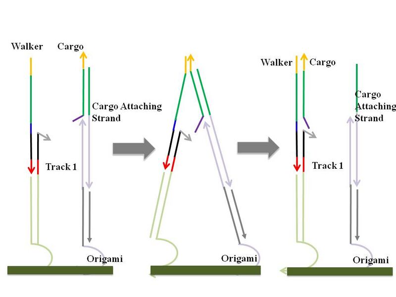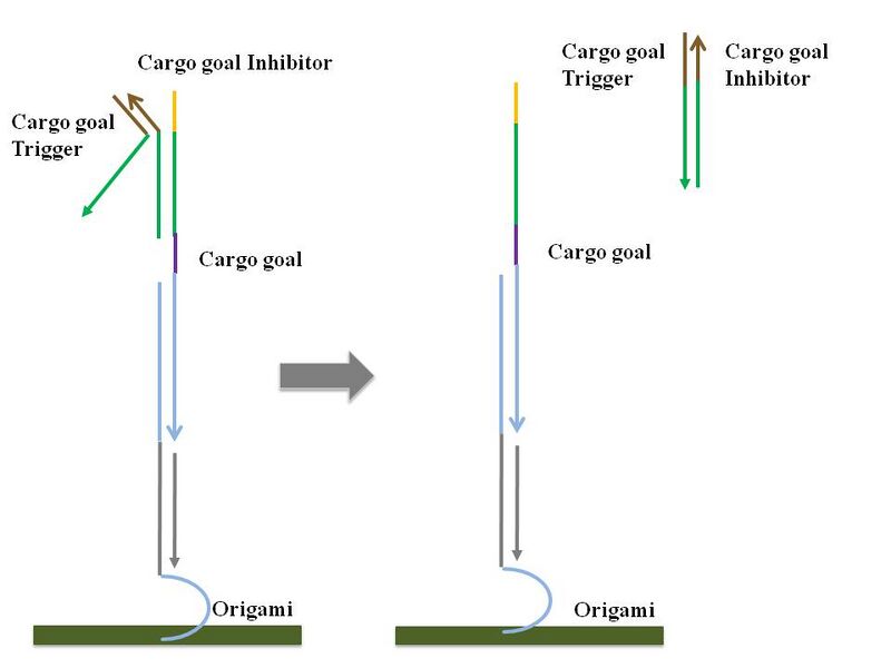 To accomplish a cargo-reorganizing-task, a walker is extended to have picking up arm which is complementary to cargos (domain x and l in figure 1). When walker randomly walks and encounters a cargo molecule, it picks up the cargo by strand displacement using toehold l. It continues random walking after picking up, and when a walker gets to the cargo goal, cargo is dropped off at the cargo goal using toehold u/u*, which both cargo and cargo goal share. Therefore, random walking process is purely stochastic, yet a deterministic end result can be achieved by specific recognition between the cargo molecules and their destinations. Another important stand is walker goal. Since walker goal contains both a1* and a2* which are complementary to the both of the toeholds of the walker, walker stays on the walker goal when it gets there. Walker goal will be used in verifying random walking on origami, and its use will be explained in later section. While the system is under construction, (e.g. track being planted), a walker or cargo goal should be deactivated to prevent undesired random walking or cargo sorting. Walker inhibitor and cargo goal inhibitor are thus designed. Later, walker trigger and cargo goal trigger will rip off the inhibitors by strand displacement using toehold wi and cgi. Detacher stands were designed to detach particular strands from samples with origami for the future gel experiments. Probes are the extended part of staples which are complementary to the bottom part of the strands which should be anchored on the origami surface. Different kinds of probes were designed for each strand. Origami will be annealed with certain staples extended with probes at predetermined positions, and some strands, such as tracks or cargo goals, will be planted on those specific positions using interaction between probe regions. Detailed mechanisms are depicted below. Random Walking MechanismThe backbone of our design is a random walker that moves across the surface of a rectangular origami. The mechanism by which said walker moves is simply strand displacement, whereby the walker contains a toehold on each end of the body, and the track strands on which it walks contains the complement of one of the two toeholds on the walker. This particular arrangement allows the walker to move randomly between track strands without modifying previously visited track segments.