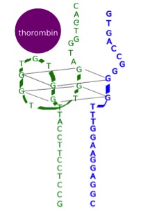 We thought of capturing thrombin. We could not experiment because of the shortage of time, but we made arrangements of the DNA that bind to thrombin, the thrombin aptamer. A part of the thrombin aptamer forms G-quartet structure to which thrombin binds(Fig. 3) (W Yoshida, K Sode, K Ikebukuro, Anal. Chem., 2006, 78 (10), pp 3297–3299).