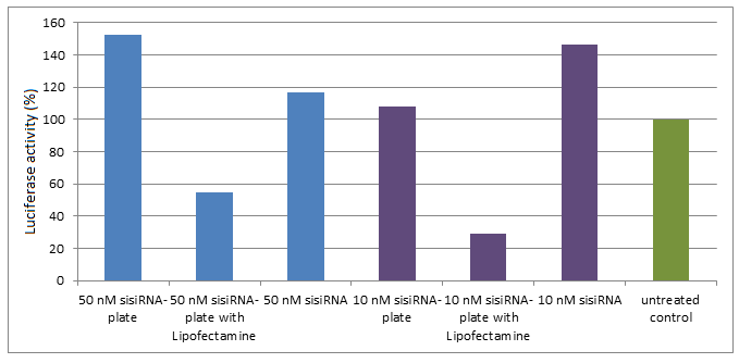 From the results in fig. 62, it appears that treating the cells with the plate with sisiRNAs attached did not induce a knockdown of luciferase. An apparent increase in luciferase activity was seen, for both concentrations, with or without the plate, corresponding to the results seen for the previous transfections without Lipofectamine. The two controls that were transfected with Lipofectamine, a knockdown was observed, indicating that the the construct did have knockdown abilities, although the two attached melittin peptides were not sufficient to mediate cellular uptake of the sisiRNAs.