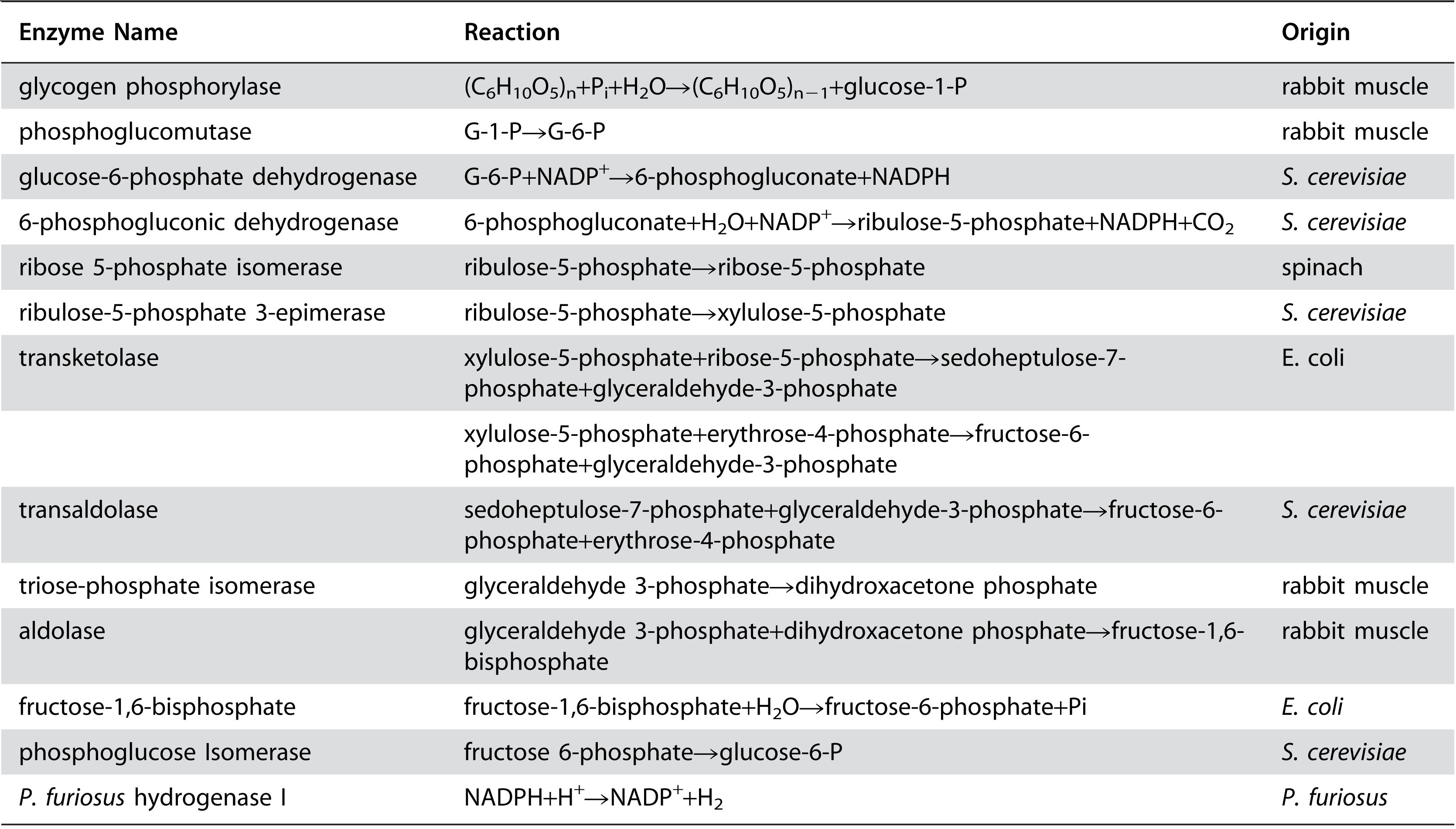 Using a different synthetic biology approach to produce hydrogen gas, Zhang et al created a synthetic enzymatic pathway employing thirteen enzymes from rabbit muscle, spinach, and three strains of bacteria (S. cerevisiae, E. Coli, P. furiosus) to convert starch and water into hydrogen and carbon dioxide, as summarized in Table X (zhang07).