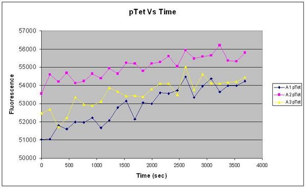 - A 1 hour run (taking measurements every 2.5 min) was also conducted to test the variation on the expression levels of pTet-GFP over time.