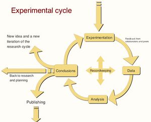 We've been talking recently about "the research pipeline" and visualizing as just that; a pipe. After talking with a bunch of OWW users and other members of the research community, I've come up with what I think is a more accurate description: the research cycle. This cycle is a series of subcycles researchers journeys through on their way to the next idea.