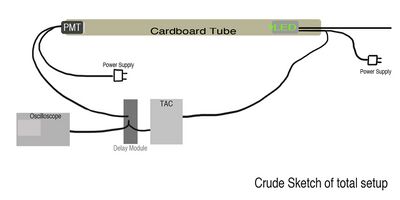 In order to measure the speed of light, we set up a long, opaque tube made of cardboard with a pulsating LED light source in one end and the photomultiplier tube on the other end of the tube. We connected the photomultiplier tube with BNC cables first to a Canberra 2058 delay module. We then connected the delay module to a Tektronix TDS 1002 digital oscilloscope in parallel with the “Stop” input on the Ortec 567 TAC/SCA Module. The Light source is also connected to the TAC in the “start” input. The delay module was set to 9 ns, to make certain that the stop signal from the PMT arrived after the start signal from the LED. This procedure is necessary due to a substantially longer BNC cable connecting the LED and the TAC. See Figure 1 for an illustration of our setup.