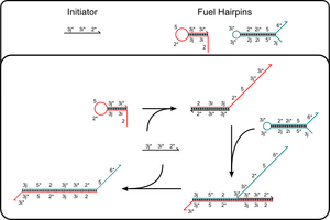 The walker utilizes a track that is composed of eight strands of DNA. Two make up the base of the track while the other six are hairpin structures (DNA that partially binds to itself) that are hybridized to the two base strands forming a long duplex with alternating hairpins along its length. These hairpins will serve as the footholds for the walker to attach itself to. The walker is driven to walk by repeated instances of the CHA reaction and a series of toehold-mediated stand displacement reactions. After the walker has taken two “steps” the second hairpin on the track will have a long duplex that a nicking enzyme will cut specifically. This will cause both pieces to dissociate from the track due to a lack in strength of binding. Because these fuels are added once to the system at the same time, and are removed from the track by a nicking enzyme, the walker is both autonomous and non-destructive to the track.