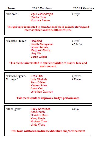 You should be in teams now working to refine your ideas to 3 distinct ones that could be presented as part of the [http://openwetware.org/wiki/20.20%28S13%29:_3_ideas_presentation 3 ideas presentation.] Assign members of the group particular tasks so you can start to work on these in greater detail. | You should be in teams now working to refine your ideas to 3 distinct ones that could be presented as part of the [http://openwetware.org/wiki/20.20%28S13%29:_3_ideas_presentation 3 ideas presentation.] Assign members of the group particular tasks so you can start to work on these in greater detail. | ||