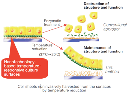 Cell sheets are designed on a surface that supports cell growth and have cell adhesion/dehesion characteristics. Originally, cell sheets were removed from culture surfaces by proteolytic enzymes, such as trypsin, pronase, or collagenase. This approach would hinder functionality of the cell sheets because the enzymes would disrupt the membrane-associated proteins, distressing the cell-cell junctions that hold the sheet together [1]. | Cell sheets are designed on a surface that supports cell growth and have cell adhesion/dehesion characteristics. Originally, cell sheets were removed from culture surfaces by proteolytic enzymes, such as trypsin, pronase, or collagenase. This approach would hinder functionality of the cell sheets because the enzymes would disrupt the membrane-associated proteins, distressing the cell-cell junctions that hold the sheet together [1]. | ||