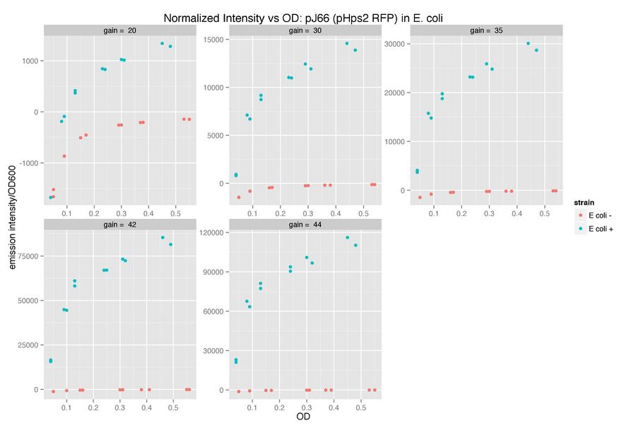 ** [[image:2013_08_fluorescence readings for at different gain values.jpg|thumb|center|upright= | ** [[image:2013_08_fluorescence readings for at different gain values.jpg|thumb|center|upright=3.0|These data represent the same E. coli line with either an empty vector control or a promoter in front of red fluorescent protein. The absorbance for each sample has been divided by OD600, then plotted as a function of OD at different gains ranging from 20 to just below saturation for the highest OD samples. -[Users:Janet B. Matsen|JM 8/2013]]] | ||
