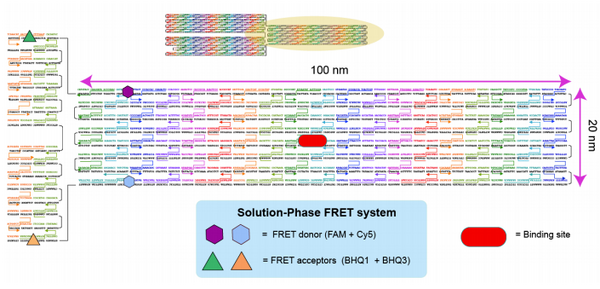 For FRET analysis, we add fluorescent dyes to the ends of some of the 'staple' strands. By varying the strand to which these dyes are added, we can change the location and orientation of the tags on the macrostructure. | For FRET analysis, we add fluorescent dyes to the ends of some of the 'staple' strands. By varying the strand to which these dyes are added, we can change the location and orientation of the tags on the macrostructure. | ||
