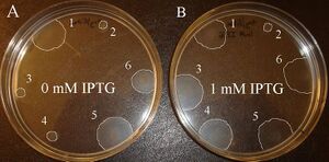 [[Image:InducedMotilitywithIPTGPSUIGEM.jpg|left|FIG 6. '''Swarm plate assay of Constructs C, D, and E with and without IPTG induction.''' Two 0.20% Eiken agar tryptone plates supplemented with Amp were used in this assay. Swarms were allowed to grow for 6 hrs. (A) Non-induced plate. (B) Plate induced with IPTG. Colony Assignments: 1, RP437 positive control; 2, RP3087 negative control; 3, RP3087 containing pDB28; 4, RP3087 containing Construct C; 5, RP3087 containing Construct D; 6, RP3087 containing Construct E. Swarms were traced using the Adobe Photoshop computer program to easily identify their sizes. Construct C swarms only on the induced plate, whereas Constructs D and E swarm on both the induced and non-induced plates. | [[Image:InducedMotilitywithIPTGPSUIGEM.jpg|left|thumb|FIG 6. '''Swarm plate assay of Constructs C, D, and E with and without IPTG induction.''' Two 0.20% Eiken agar tryptone plates supplemented with Amp were used in this assay. Swarms were allowed to grow for 6 hrs. (A) Non-induced plate. (B) Plate induced with IPTG. Colony Assignments: 1, RP437 positive control; 2, RP3087 negative control; 3, RP3087 containing pDB28; 4, RP3087 containing Construct C; 5, RP3087 containing Construct D; 6, RP3087 containing Construct E. Swarms were traced using the Adobe Photoshop computer program to easily identify their sizes. Construct C swarms only on the induced plate, whereas Constructs D and E swarm on both the induced and non-induced plates.]] | ||