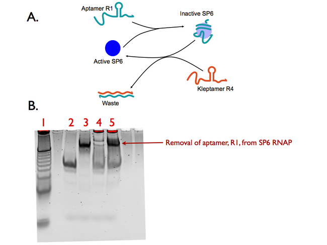 Inhibition of the modules is not sufficient for RNA clocks and switches. It must also be possible for the enzymes to regain transcriptional activity after the addition of the kleptamer. The following experiments show unequivocally that the kleptamers can successfully undermine inhibition. The extent of reactivation varies for both, T7 and SP6, RNA Polymerase systems. T7 RNAP does not seem to reactivate completely but this may be sufficient for our purposes. SP6 RNA Polymerase is reactivated to completion and is very efficient. Both gels show the interactions between all components are taking place as expected. The amount of aptamer binding to the enzyme is greatly diminished after the addition of the kleptamer in lanes 6 and 7.
