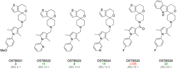 Variation in the promising "hybrid compound" consisting of the spirocycle core appended with the aryl pyrrole (used widely in OSM Series 1) was explored by Jessica Baiget working at GSK Tres Cantos. The following compounds were made and evaluated.