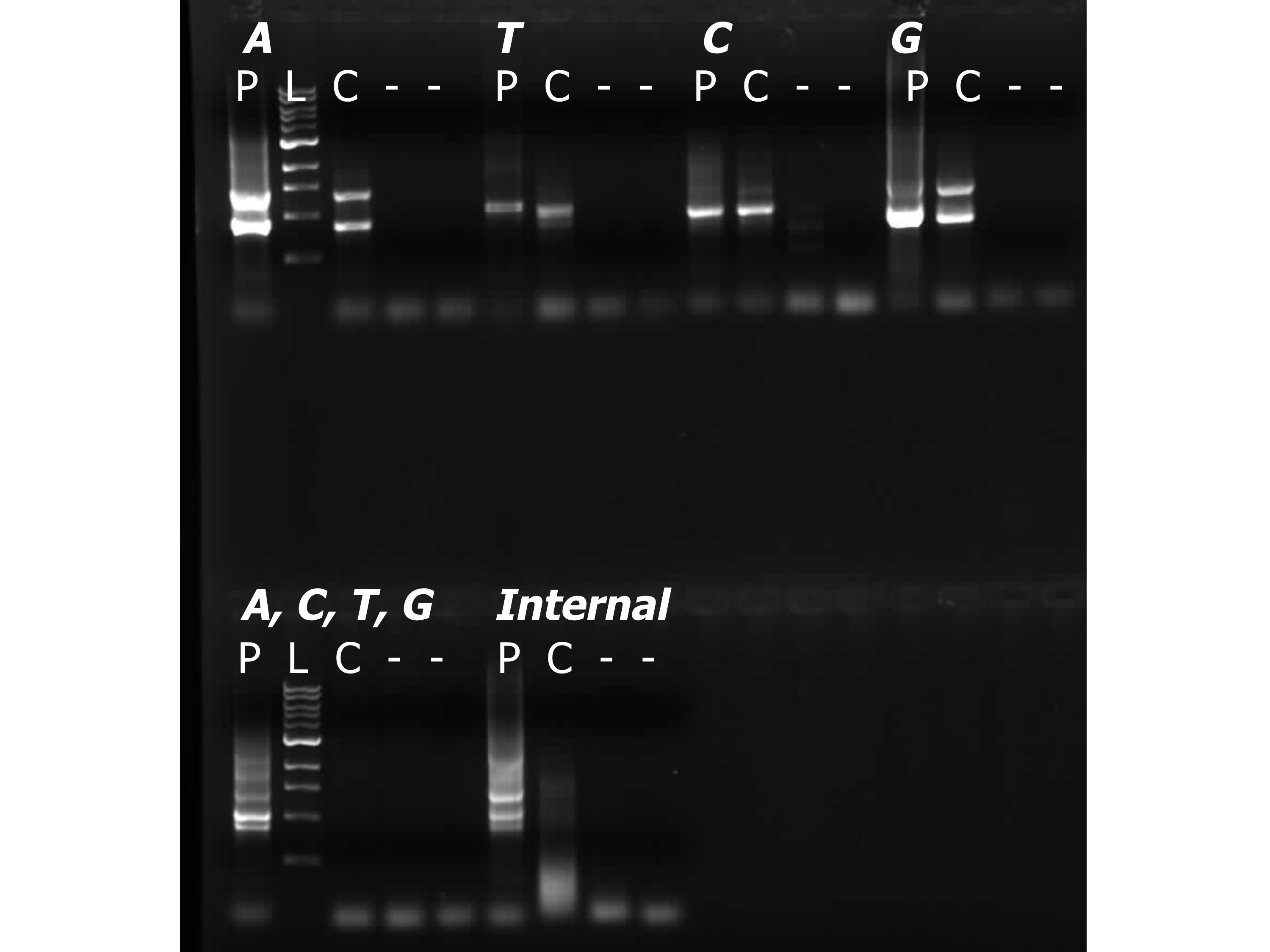 Today, with Jen's help, we both ran six PCR reactions (each single primer pair plus all four base-specific primers in a single mix). We used four templates: purified synchronator DNA, MC4100 cells containing synchronator plasmid, MC4100 cells (not containing any BioBricks), water.