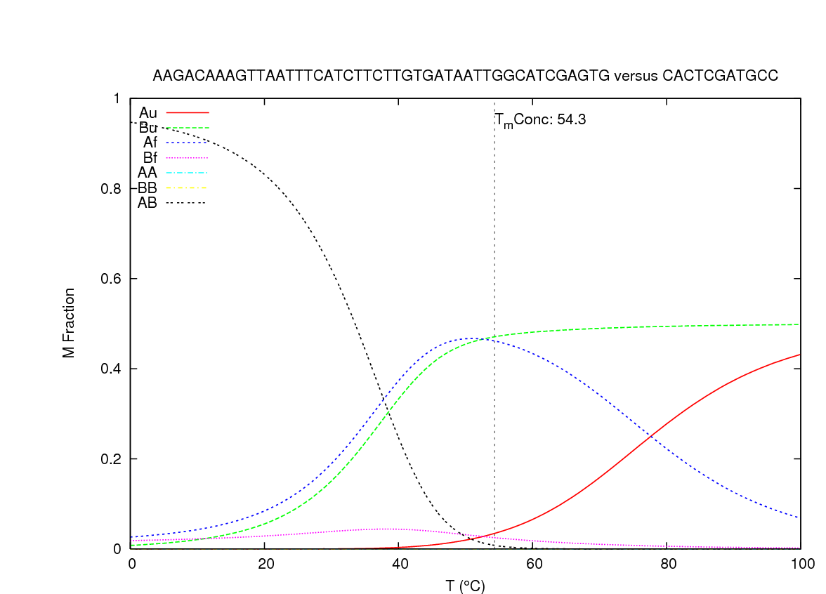 The image shown below is one example of simulation using DINAMelt (http://mfold.rna.albany.edu). This is a simulation of the melting temperature and the possibility of correct hybridization. This is simulated under a situation of