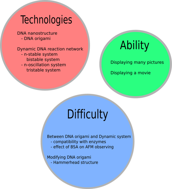 DNA is used as in information storage molecule and one of its most significant characteristic is stability. Previously, many DNA nanostructures have been designed that make use of this stability. Although stability is a merit of DNA, many functions requires a form of variability of the device that perform them. It has been recently discovered that DNA can also be used to perform dynamic functions in artificial systems. In this case DNA somehow plays the role of RNA molecules in biology. DNA based dynamic circuits can be used to perform computations, to build clocks, to control processes, or to create updatable memories that store some bits of information. In these cases however the DNA molecules needs to be continuously rearranged by participating in chemical reactions. In some case, they even need to be degraded for the function to occur. So on one hand DNA is a stable material used to build robust molecular shapes, but on the other hand it is a reactive participant of dynamic reaction networks. Can we bring back these two features together in order to get the best of both approaches ? UT-Komaba team tries to illustrate the potentials of this approach by designing the DNA tablet, the smallest tablet PC on earth.