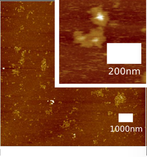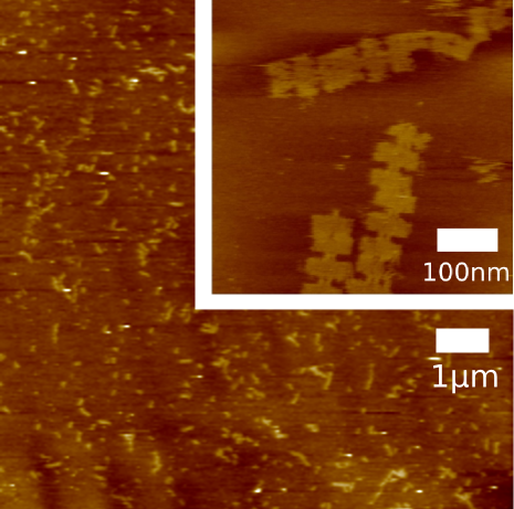 These DNA origami (M13 + all staples) were observed by using atomic force microscope (AFM) to confirm that these DNA Shell were formed correctly. 1xTAE/Mg solution was utilized as buffer.