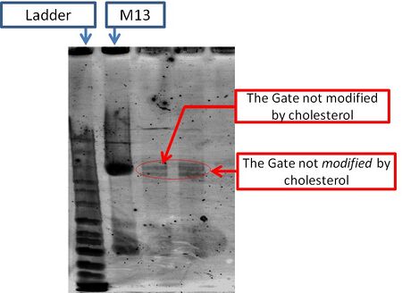 We attached cholesterol to the single-stranded DNA, and confirmed by electrophoresis.