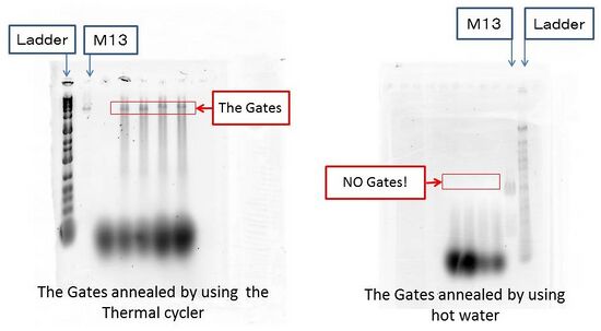 We mixed M13mp18 and staples of tube and annealed them. We tried two annealing method. The one is annealing with boiled water, and the other is annealing based on ” A Logic-Gated Nanorobot for Targeted Transport of Molecular Payloads”. And we did electrophoresis using this sample. This results is following.(お湯とショーンの比較泳動結果はる)As a result of the experiment, we got that the Shawn annealing was better than annealing with boiled water. And the tube structure made on Shawn annealing was observed by AFM. This result is following.(AFM画像をはる)