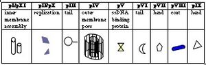 | IX | 32 | phage head protein (5 copies) | stop codon overlaps start of gVIII |