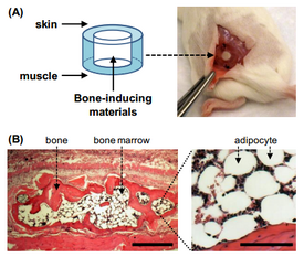 Models have also utilized in vivo capturing of bone marrow cells and combined microfluidic culture. For example, Figure 2 shows a hollow, barrel shaped PDMS subcutaneous insert. This insert induces growth of bone marrow into the chamber, which can then be surgically removed and cultured in a microfluidic device [6]. There are other models similar to this which have porous, bone-like, growth-inducing materials which are used in vivo and then transported to a microfluidic culture chamber. In vivo models have also shown formation of vasculature.