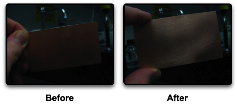 The next stage is to clean the circuit board and transfer the image onto it. If you do not scrub the circuit board with a scouring pad and clean it with acetone, the image will not adhere. The below picture shows a before cleaning and after cleaning the circuit board picture.