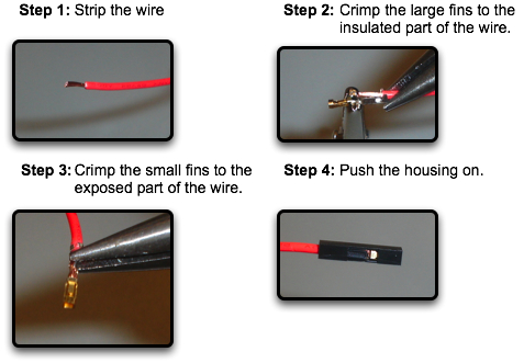 The next step is to make connectors that connect to the circuit board. To do this, you will need some header housings and some header crimp connectors. Make sure that the crimp connectors you purchase and the housings will fit into each other. Many companies make these types of connections and while the form factor is standard, the way in which the connector fits into the housing is not. To make the header connectors, just follow the below steps.
